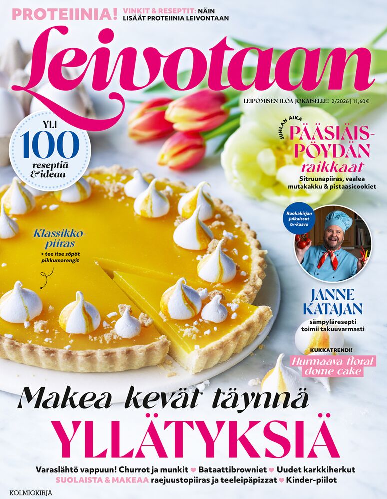 Ajankohtaiset reseptit ja ohjeet pitävät sinut ajantasalla kausittaisista keittiöuutisista. Leivotaan ilmestyy seitsemän kertaa vuodessa, joista kolme numeroa ovat upeita aina ajankohtaan sopivia teemanumeroita. Jokaisessa numerossa on yli 100 ohjetta ja ideaa!