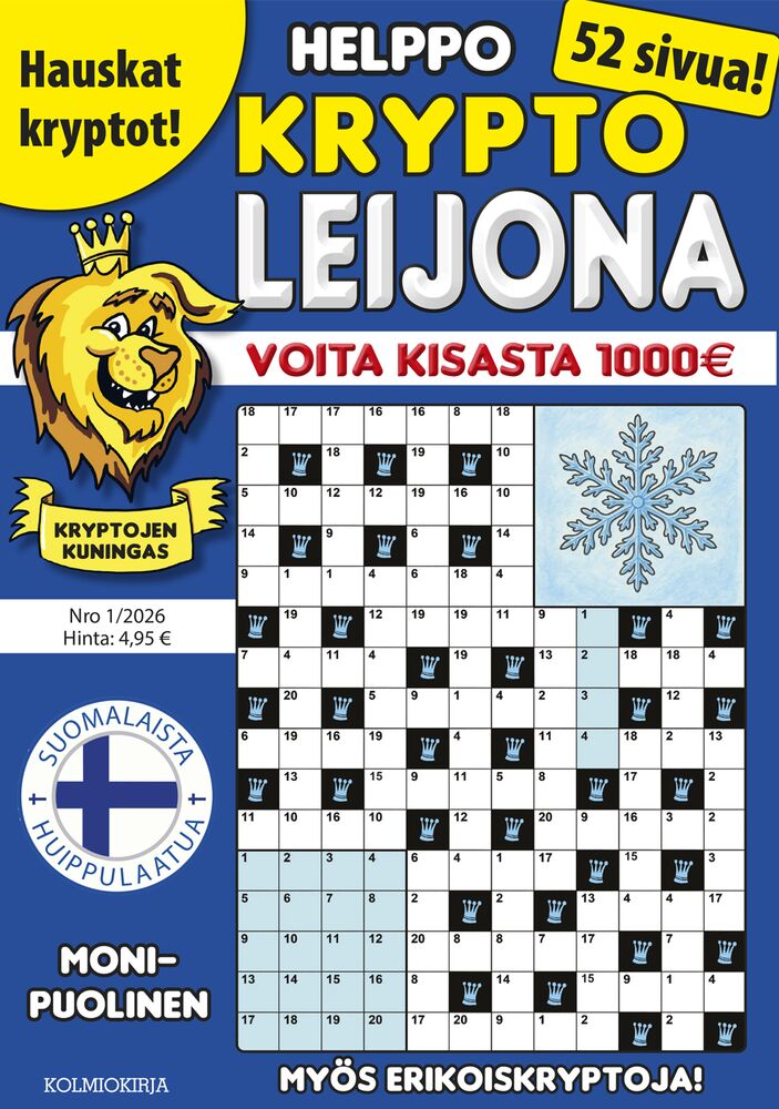 Krypto-Leijona – kryptojen kuningas! Krypto-Leijonassa on reilusti tehtäviä ja mainio hinta-laatusuhde! 52-sivuisen ratkontapaketti on Suomen parhaiden kryptolaatijoiden käsialaa. Mukana on myös suosittuja erikoistehtäviä, kuten avokryptoja, kryptoristikkoja ja teemakryptoja! Krypto-Leijona on jokaisen kryptojen ystävän ykkösvalinta. Mukana myös bonuskilpailu, josta voi voittaa 1000 euroa!