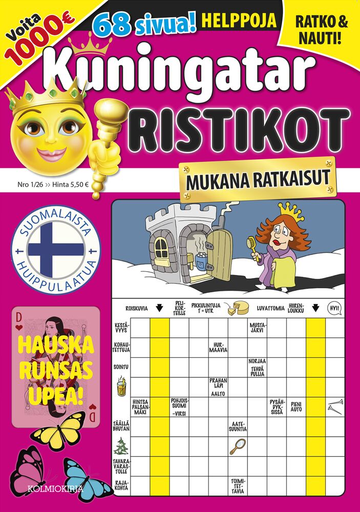 Kuningatar-Ristikot on 68-sivuinen, monipuolinen ja laadukas ristikkolehti helppojen ristikoiden ystävälle. Kaikki lehden tehtävät ovat uusia, ennen julkaisemattomia suomalaisten huippulaatijoiden suosituimpia kuvaristikoita ja erikoistehtäviä. Lehden lopusta löydät myös oikeat ratkaisut. Kuningattarella on aina pieni pilke silmäkulmassa, joten oivalluksen ilon lisäksi hymy ja nauru piristävät antaen lisäenergiaa päivään. Mukana on Kuningattaren Tonnikisa, josta voi voittaa mahtavat 1000 euroa puhtaana käteen!