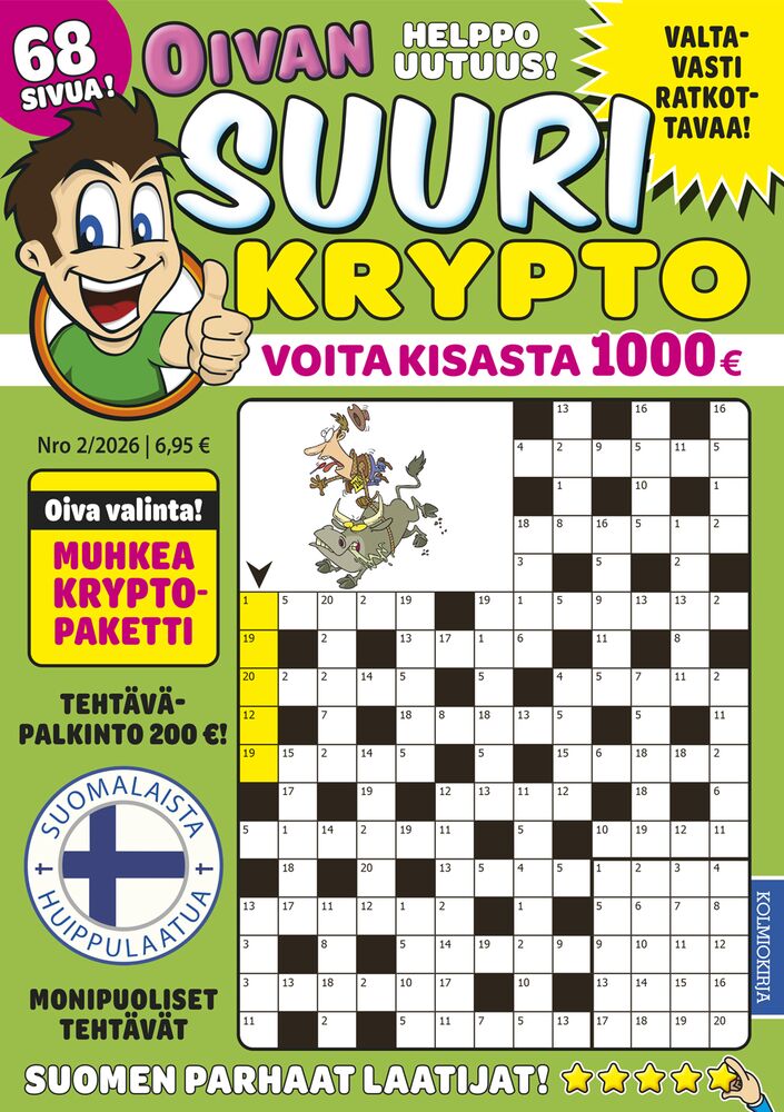 Suomen monipuolisin kryptolehti tarjoaa sopivan helppoja ja sanastoltaan ensiluokkaisia kryptoja Suomen parhailta laatijoilta.