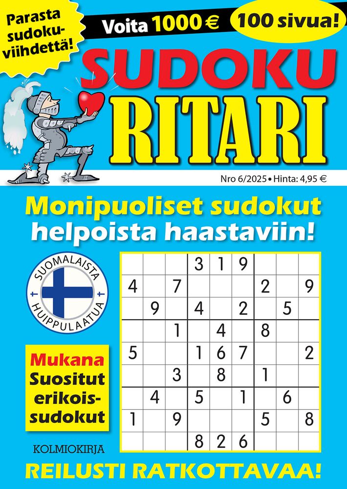 100-sivuinen Sudoku-Ritari sisältää tehtäviä helpoista haastaviin pähkinöihin. Mukana on reilusti toivottuja erikoistehtäviä, kuten hypersudokuja, kakuroja, linkkisudokuja ja paljon muuta! Tehtävät on sijoiteltu väljästi, jotta numeromuistiinpanoille jää enemmän tilaa. Kaikkien tehtävien ratkaisut löytyvät lehden loppuosasta. Mukana bonuskilpailu, josta voi voittaa 1000 euroa!