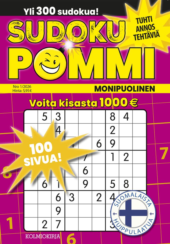 100-sivuinen SudokuPommi tarjoaa yli 300 sudokua näppärässä koossa. Tehtävien vaikeustaso painottu helppoihin sudokuihin, mutta myös haastetta haluaville on tarjolla keskivaikeita ja vaikeita sudokuja. Lehti sisältää lisäksi laajan erikoistehtäväosion, josta löytyy pidetyimpiä erikoistehtävätyyppejä, kuten kakuroja, 3D-sudokuja, palapelisudokuja ja jättisudokuja. Mukana bonuskilpailu, josta voi voittaa 1000 euroa!